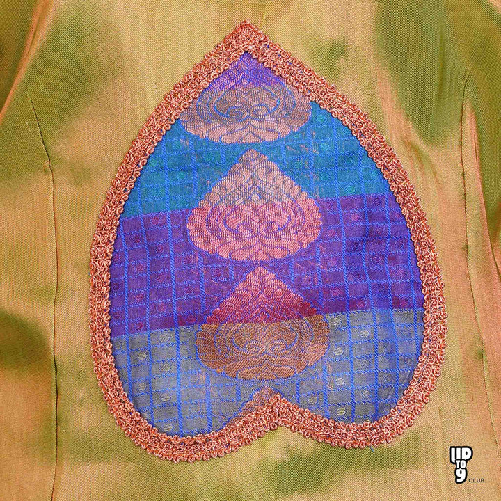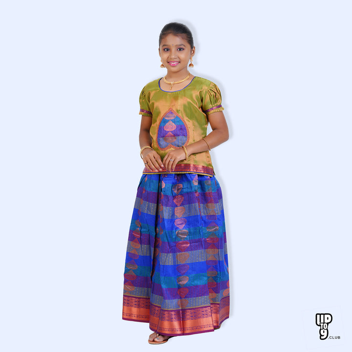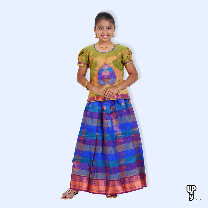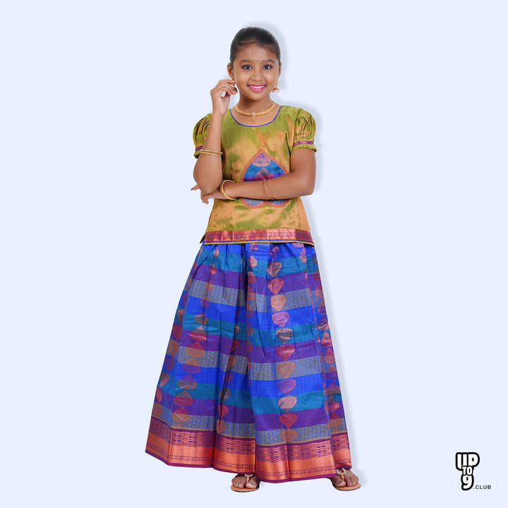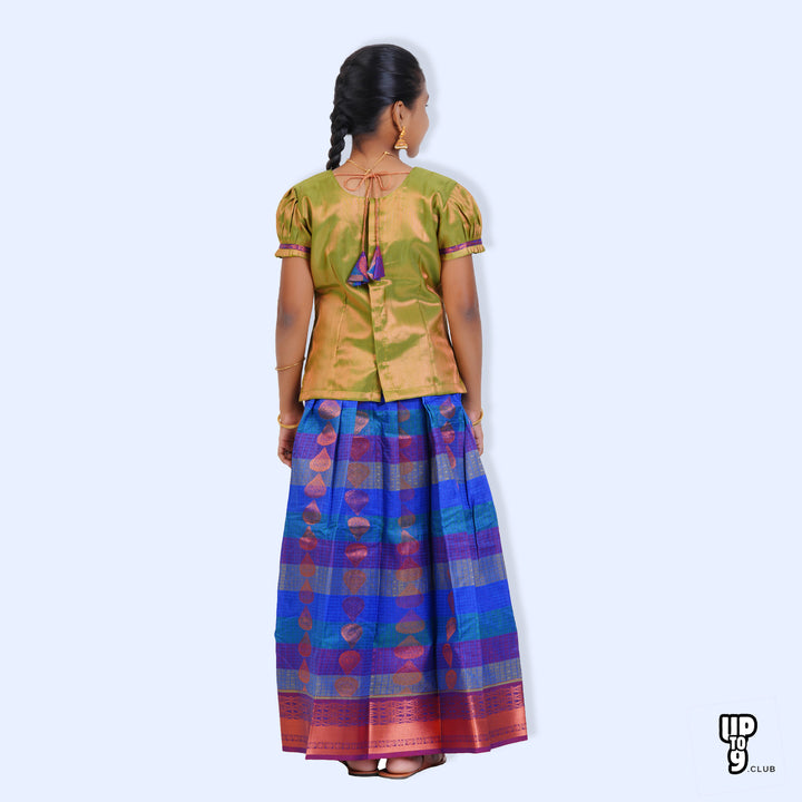 SKV ETHNIVERSE Girls, Traditional Indian Lehenga choli Set, Blue with light green ethnic wear, Copper zari emboss pattu pavadai