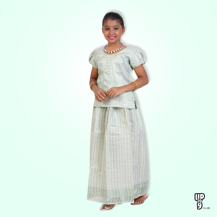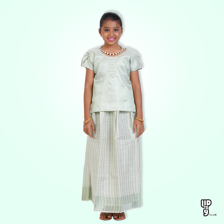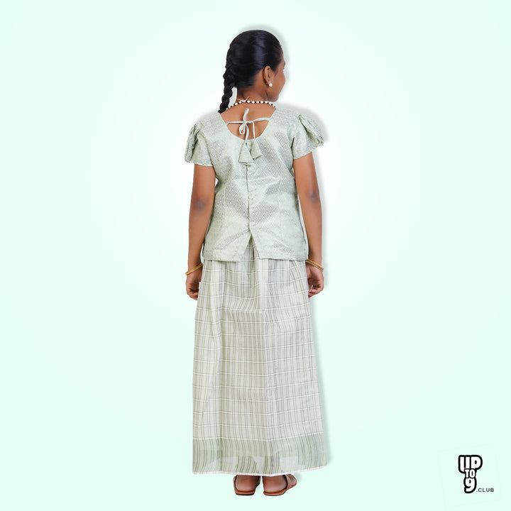 SKV Ethniverse Girl's Traditional Indian Lehenga Choli Set, jaquard and mint green zari Kerala cotton pattu pavadai