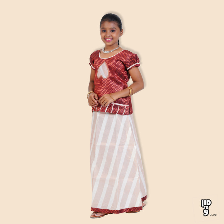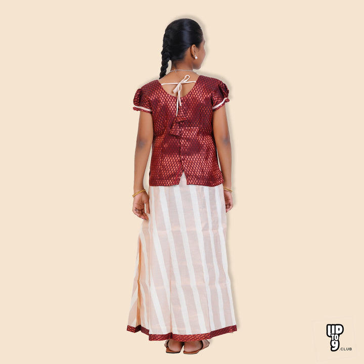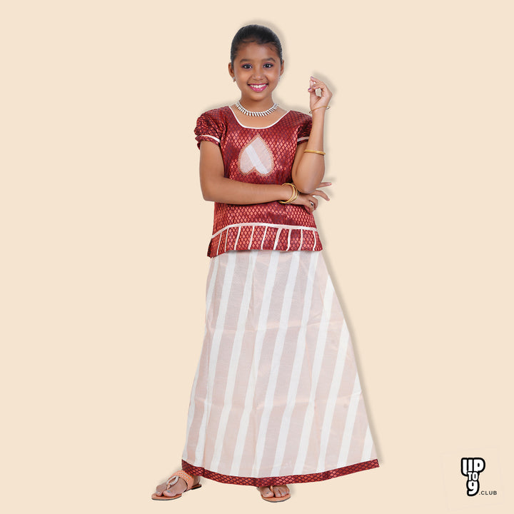 SKV Ethniverse Girl's Traditional Indian Lehenga Choli Set, copper jari jacquard, Kerala cotton Striped pattu pavadai