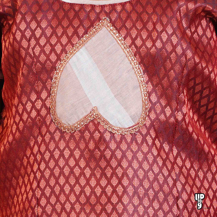 - Vibrant Ethnic Style: This elegant and colorful ethnic dress features a copper jari jacquard top with intricate embellishment and a flowing print skirt.