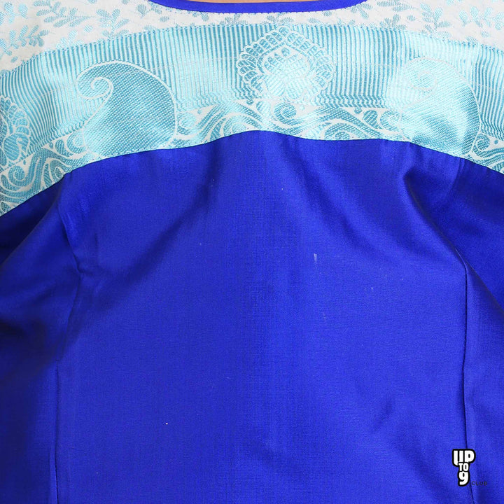 - Vibrant Ethnic Style: This elegant and colorful ethnic dress features a Blue and Aqua top with intricate embellishment and a flowing print skirt.