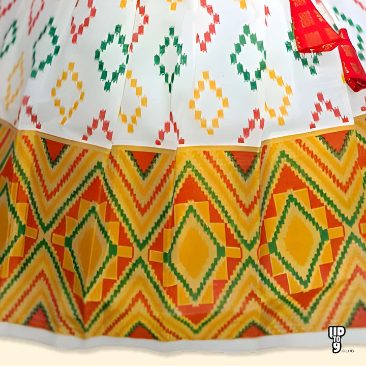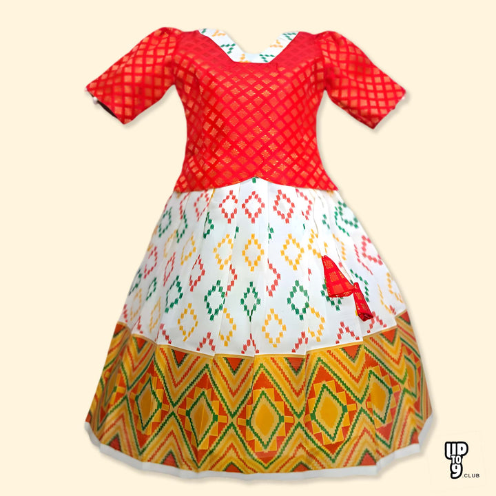 - Vibrant Ethnic Style: This elegant and colorful ethnic dress features a Banaras-Cotton top with intricate embellishment and a flowing print skirt.
