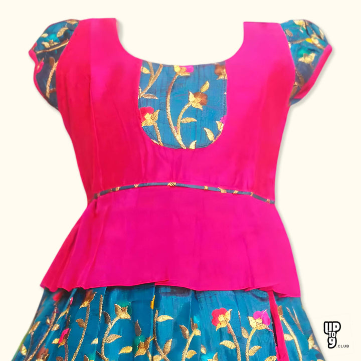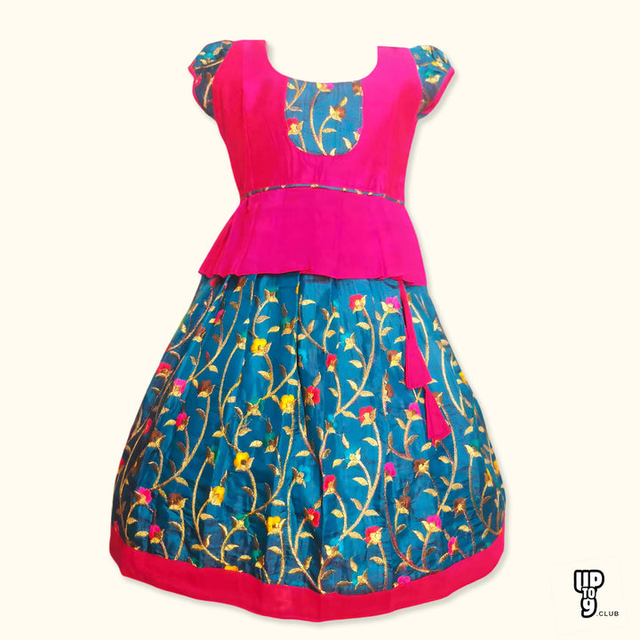 - Vibrant Ethnic Style: This elegant and colorful ethnic dress features a Banarasi Silk top with intricate embellishment and a flowing print skirt.