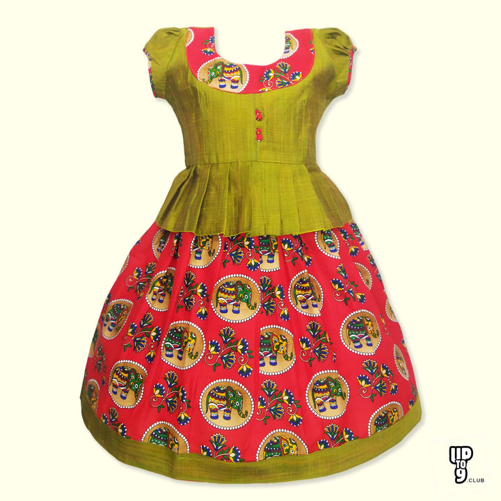 - Vibrant Ethnic Style: This elegant and colorful ethnic dress features a Banarasi Silk top with intricate embellishment and a flowing print skirt.