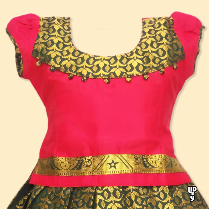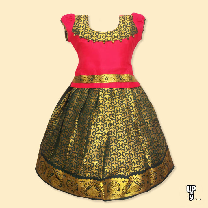 - Vibrant Ethnic Style: This elegant and colorful ethnic dress features a Jacquard Silk top with intricate embellishment and a flowing print skirt.