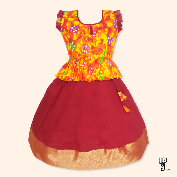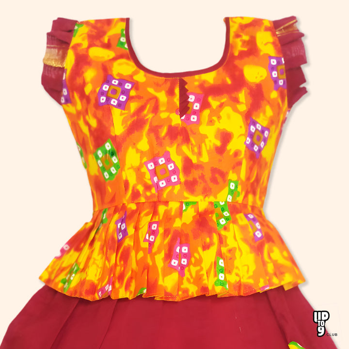 - Vibrant Ethnic Style: This elegant and colorful ethnic dress features a Cotton top with intricate embellishment and a flowing print skirt.