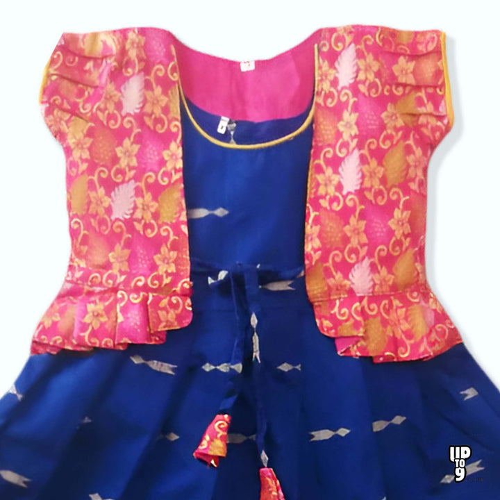 - Vibrant Ethnic Style: This elegant and colorful ethnic dress features a Banaras Cotton top with intricate embellishment and a flowing print skirt.