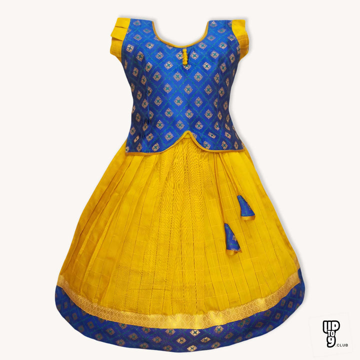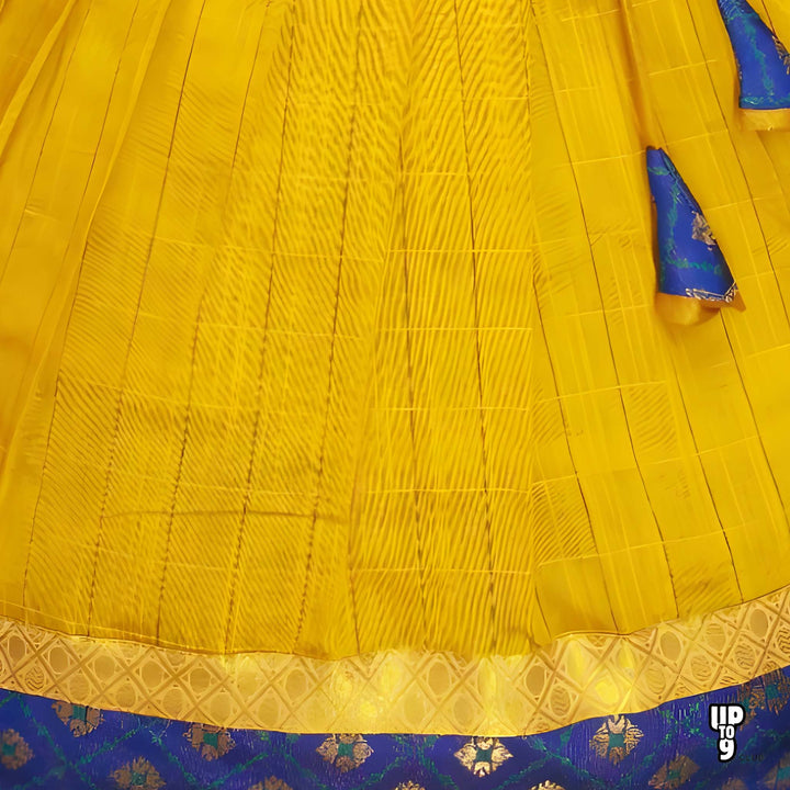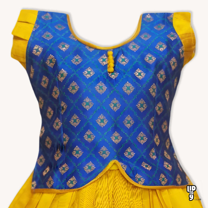 SRI LAKSHMI NARAYANA Girls Traditional Indian Lehenga Choli Set, Blue and Yellow, Banaras - Slub Checkered Silk Pattu Pavada 313SP