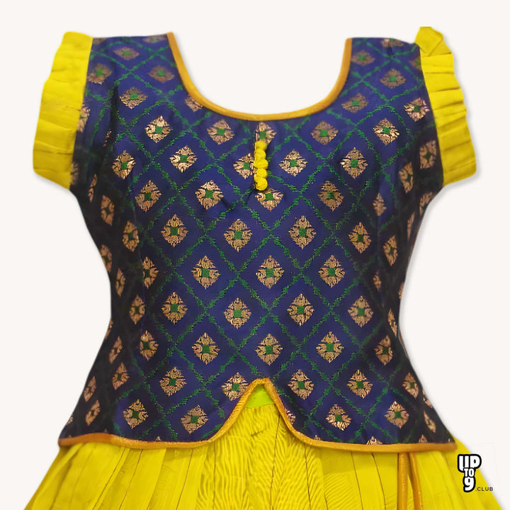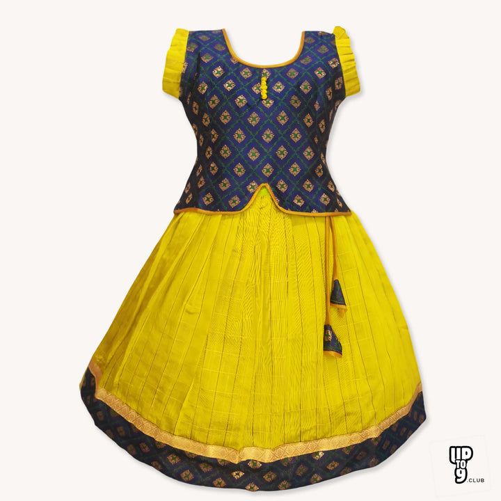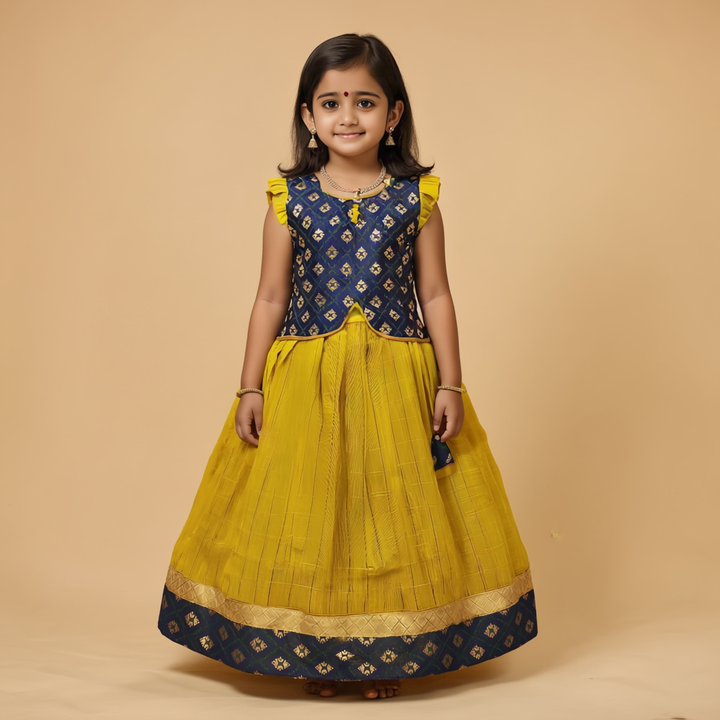 SRI LAKSHMI NARAYANA Girls Traditional Indian Lehenga Choli Set, Dark Blue and Gold , Banaras - Slub Checkered Silk Pattu Pavada 313SP