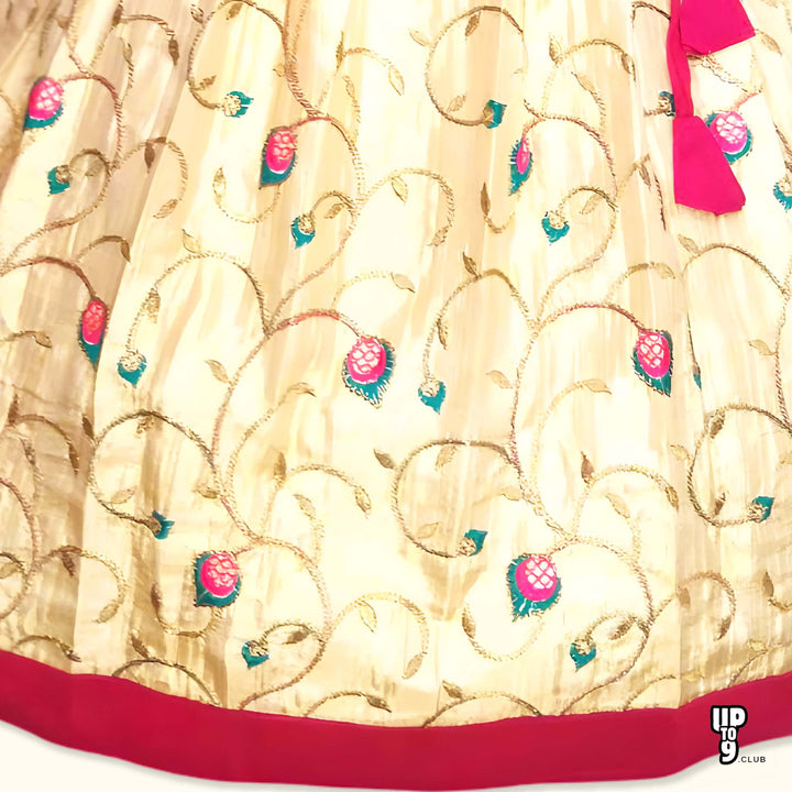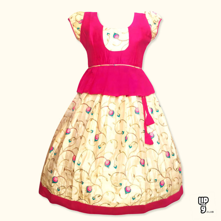 - Vibrant Ethnic Style: This elegant and colorful ethnic dress features a Banarasi Silk top with intricate embellishment and a flowing print skirt.