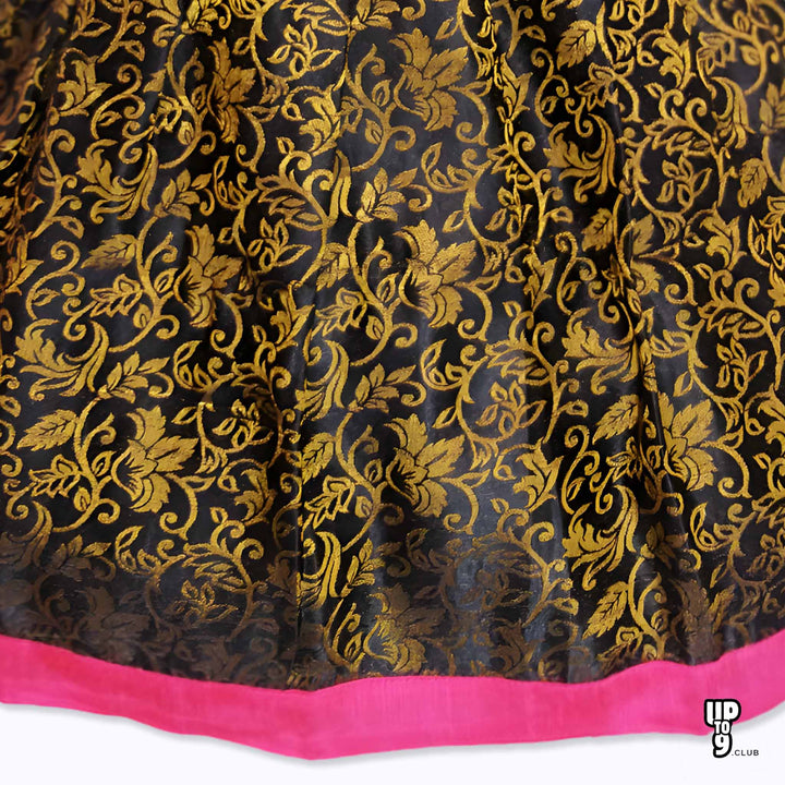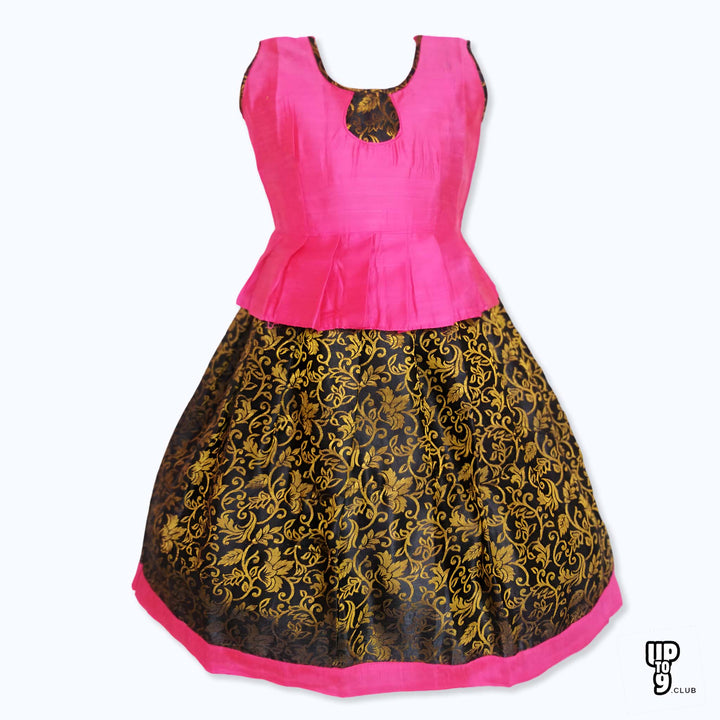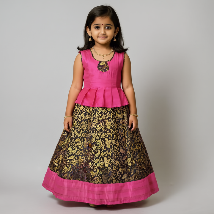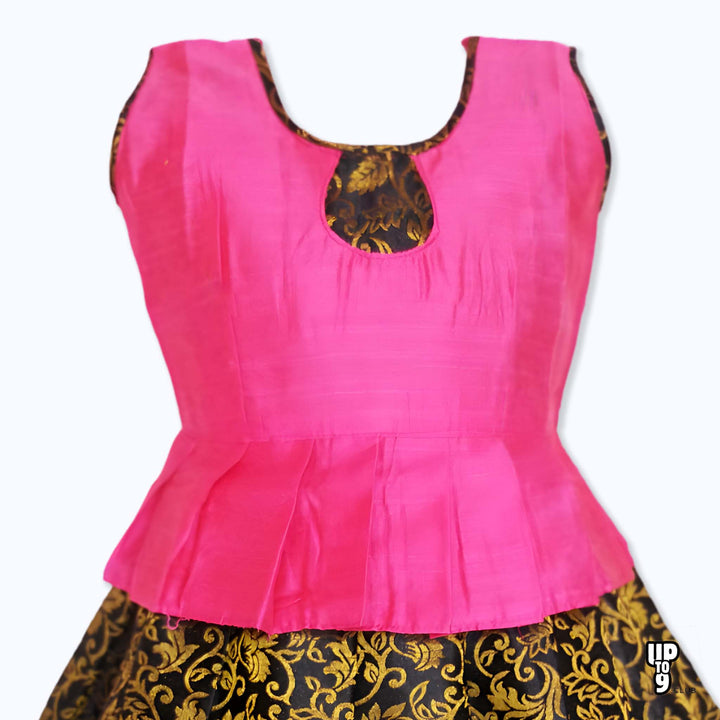 SRI LAKSHMI NARAYANA Girls Traditional Indian Lehenga Choli Set, Pink and Black, Banaras - Slub Silk Pattu Pavada 310SPH